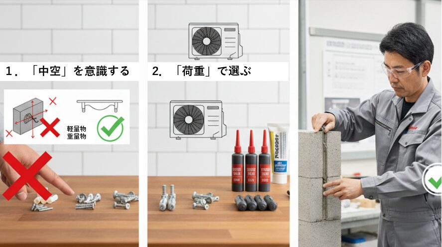 「何を(荷重)」を「どこに(母材の状態)」固定するのか。この組み合わせで、使うべきアンカーが決まります。