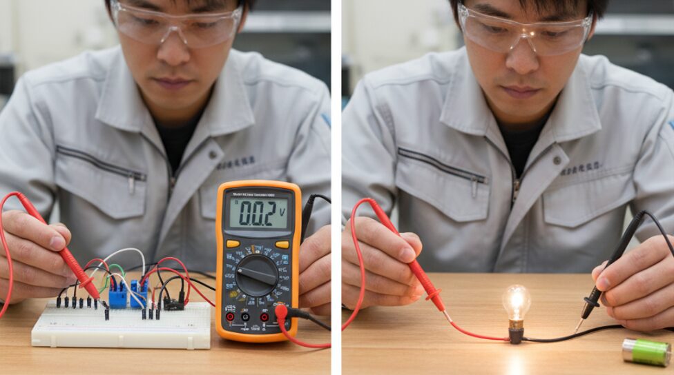 電圧測定は、回路内の2点間の電位差(電圧の高さの差)を測るのが目的です。そのため、測定したい回路(例えばコンセントの2穴)に対して並列にプローブを当てます。このとき、テスターが測定対象の回路に影響を与えてはいけないので、電圧モードのテスターは、内部抵抗が極めて高く(例えば10MΩ=1000万Ω)設計されています。抵抗が非常に高いため、テスター内部にはごくわずかな電流しか流れ込まず、回路に負荷をかけることなく安全に電圧だけを読み取ることができます。テスターは回路の傍観者として機能するわけですね。